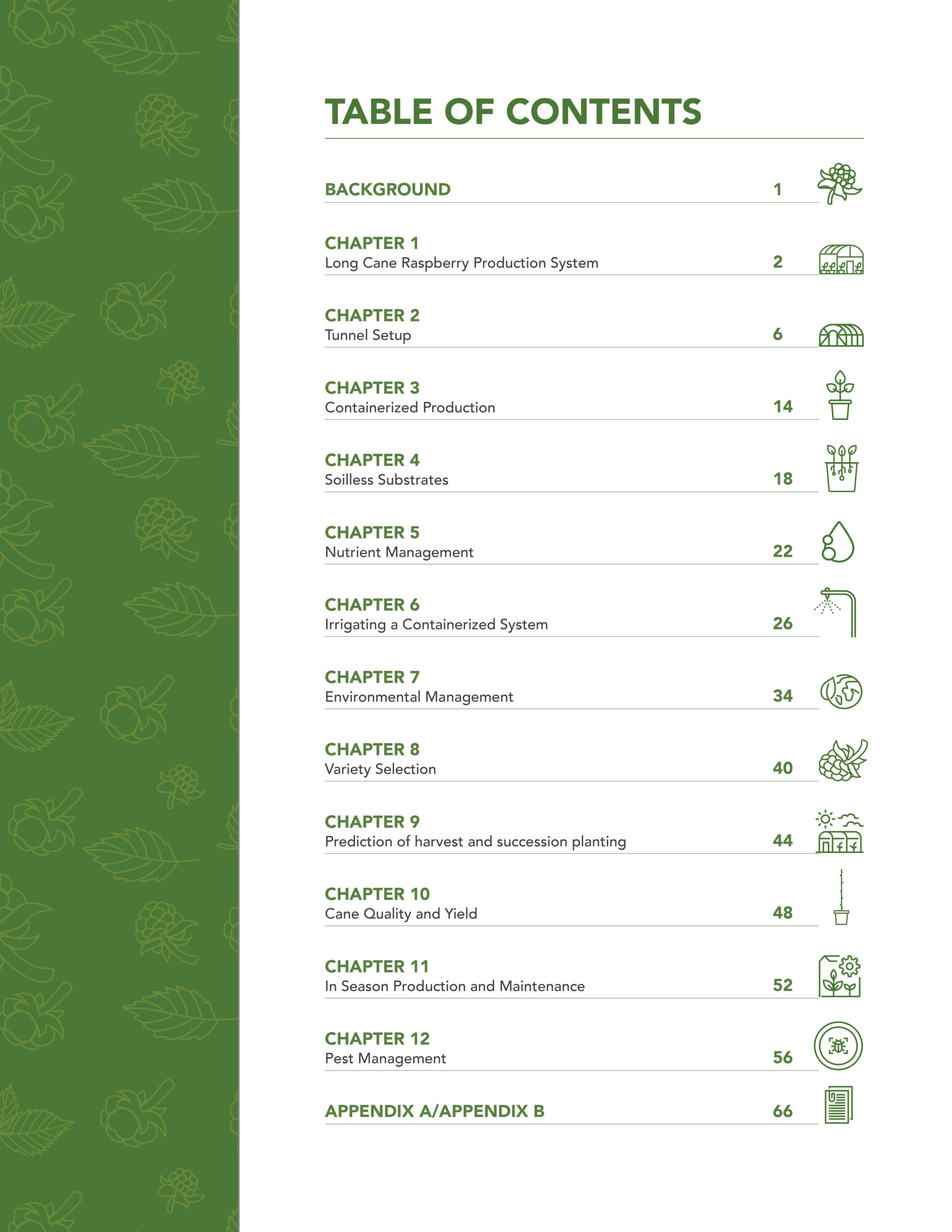 The traditional method for raspberry production is limited in its ability to achieve reliable, long-term success for a handful of reasons: the build-up of soilborne disease, nematodes and viruses over time; the susceptibility of raspberry canes to winter injury, which negatively impacts yield; and the vulnerability to weather events such as precipitation, hail and frost. In an industry where little growth has taken place in recent years, innovation and re-evaluation of current production practices are necessary to re-invigorate local production and meet the growing demand for raspberries.