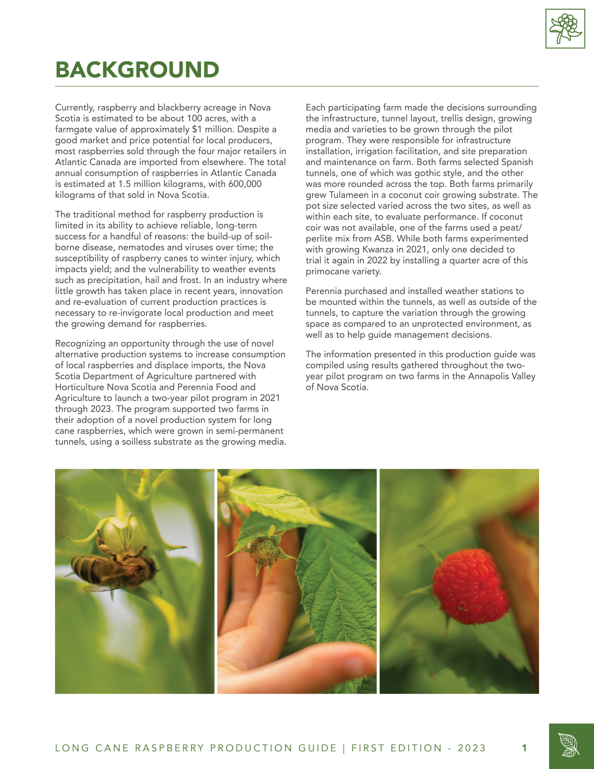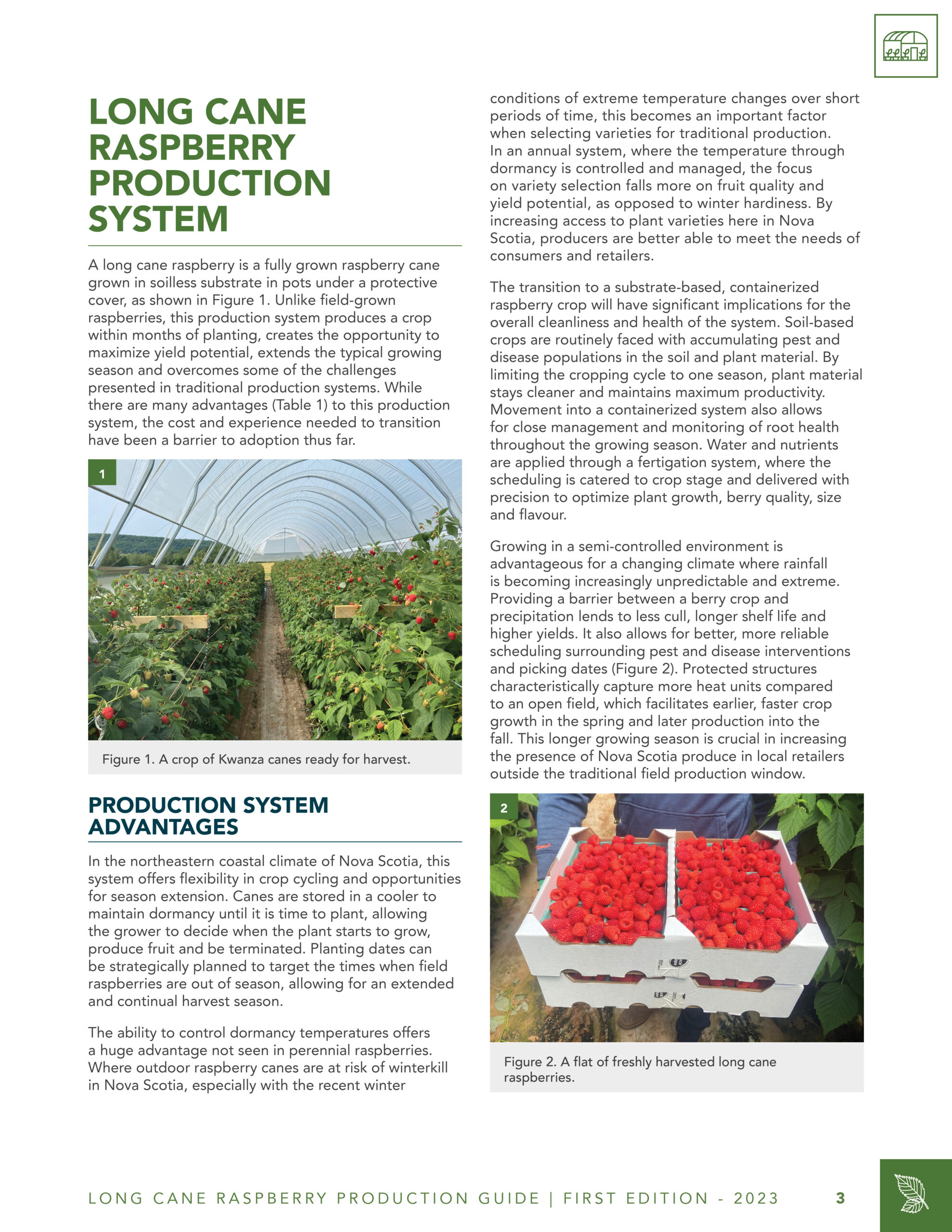Recognizing an opportunity through the use of novel alternative production systems, the Nova Scotia Department of Agriculture partnered with Horticulture Nova Scotia and Perennia Food and Agriculture to launch a two-year pilot program in 2021 through 2023. The program supported two farms in their adoption of a novel production system for long cane raspberries, which were grown in semi-permanent tunnels, using a soilless substrate as the growing media. This innovative method of production was implemented to increase local production of raspberries and displace Nova Scotia’s reliance on soft berry imports.
